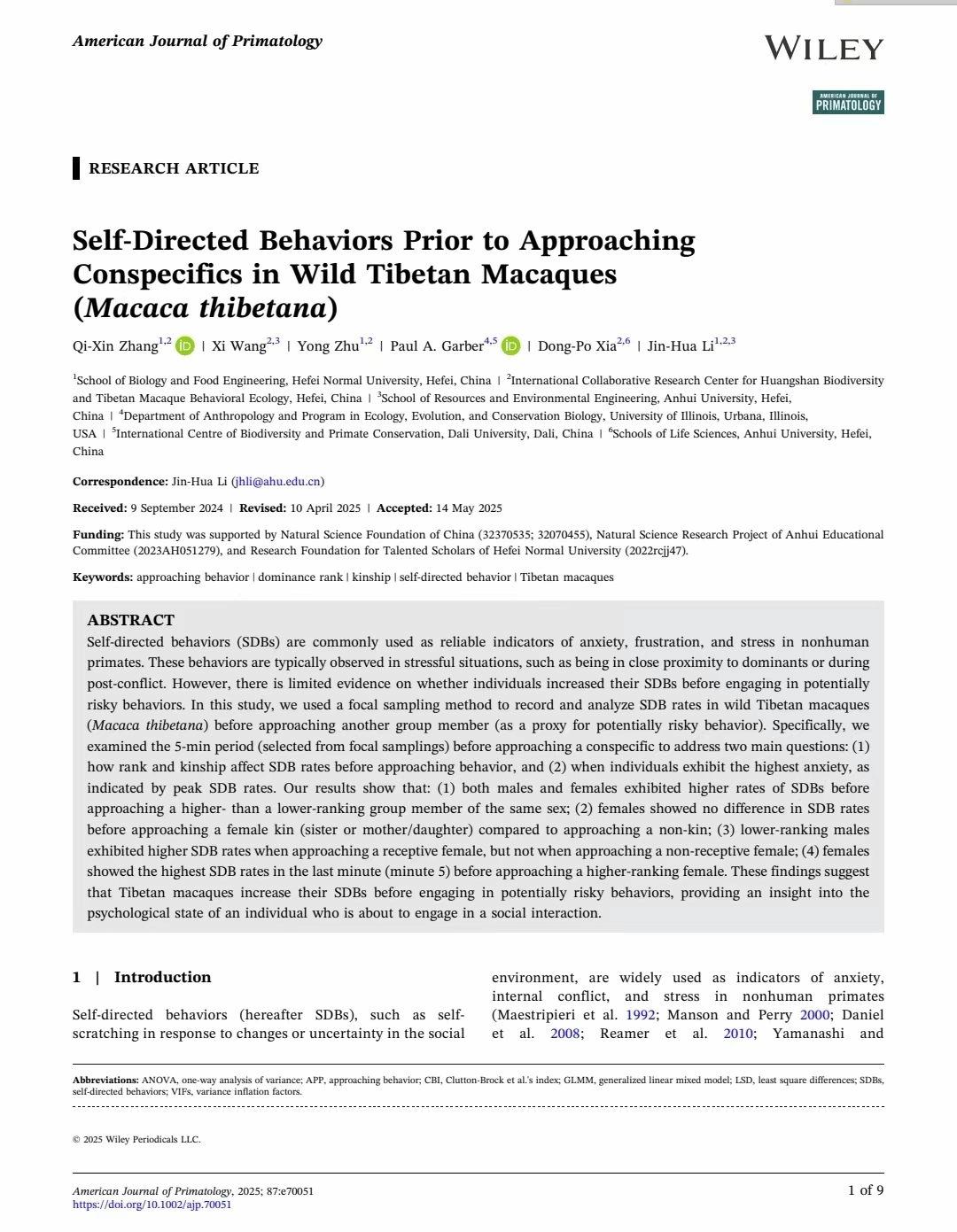 近日,英国威廉希尔英文李进华教授团队在《American Journal of Primatology》(中国科学院二区)在线发表了题为“Self-Directed Behaviors Prior to Approaching Conspecifics in Wild Tibetan Macaques (Macaca thibetana)”的科研论文,该研究为理解群居非人灵长类动物对社会关系认知提供新的参考。